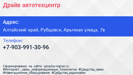 Драйв, автотехцентр по адресу Алтайский край, Рубцовск, Арычная улица, 7в в дальнейшем Организация, размещена в следующих категориях: