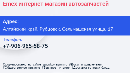 Emex, интернет-магазин автозапчастей по адресу Алтайский край, Рубцовск, Сельмашская улица, 17 в дальнейшем Организация, размещена в следующих категориях: