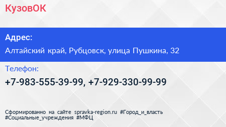 КузовОК по адресу Алтайский край, Рубцовск, улица Пушкина, 32 в дальнейшем Организация, размещена в следующих категориях:
