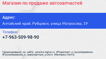 Магазин по продаже автозапчастей по адресу Алтайский край, Рубцовск, улица Матросова, 19 в дальнейшем Организация, размещена в следующих категориях: