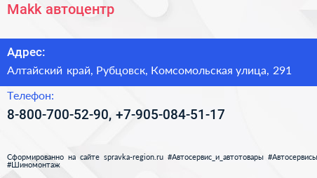 Makk, автоцентр по адресу Алтайский край, Рубцовск, Комсомольская улица, 291 в дальнейшем Организация, размещена в следующих категориях: