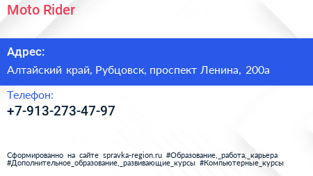 Moto Rider по адресу Алтайский край, Рубцовск, проспект Ленина, 200а в дальнейшем Организация, размещена в следующих категориях: