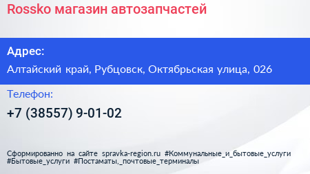 Rossko, магазин автозапчастей по адресу Алтайский край, Рубцовск, Октябрьская улица, 026 в дальнейшем Организация, размещена в следующих категориях: