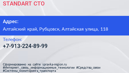 STANDART, СТО по адресу Алтайский край, Рубцовск, Алтайская улица, 118 в дальнейшем Организация, размещена в следующих категориях: