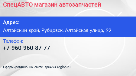 СпецАВТО, магазин автозапчастей по адресу Алтайский край, Рубцовск, Алтайская улица, 99 в дальнейшем Организация, размещена в следующих категориях: