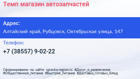 Темп, магазин автозапчастей по адресу Алтайский край, Рубцовск, Октябрьская улица, 147 в дальнейшем Организация, размещена в следующих категориях: