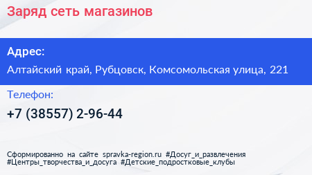Заряд, сеть магазинов по адресу Алтайский край, Рубцовск, Комсомольская улица, 221 в дальнейшем Организация, размещена в следующих категориях: