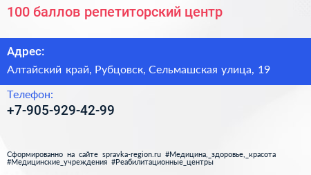 100 баллов, репетиторский центр по адресу Алтайский край, Рубцовск, Сельмашская улица, 19 в дальнейшем Организация, размещена в следующих категориях: