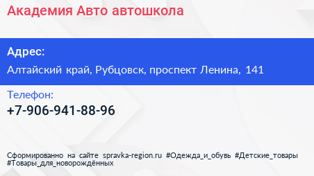 Академия-Авто, автошкола по адресу Алтайский край, Рубцовск, проспект Ленина, 141 в дальнейшем Организация, размещена в следующих категориях:
