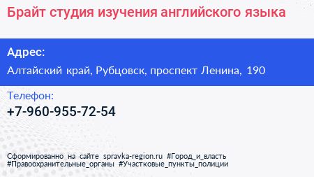Брайт, студия изучения английского языка по адресу Алтайский край, Рубцовск, проспект Ленина, 190 в дальнейшем Организация, размещена в следующих категориях: