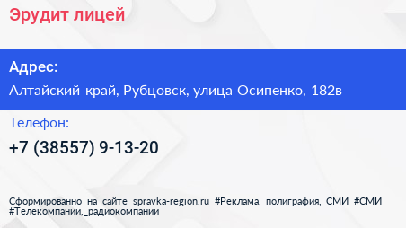 Эрудит, лицей по адресу Алтайский край, Рубцовск, улица Осипенко, 182в в дальнейшем Организация, размещена в следующих категориях: