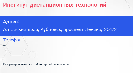 Институт дистанционных технологий по адресу Алтайский край, Рубцовск, проспект Ленина, 204/2 в дальнейшем Организация, размещена в следующих категориях: