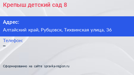 Крепыш, детский сад №8 по адресу Алтайский край, Рубцовск, Тихвинская улица, 36 в дальнейшем Организация, размещена в следующих категориях: