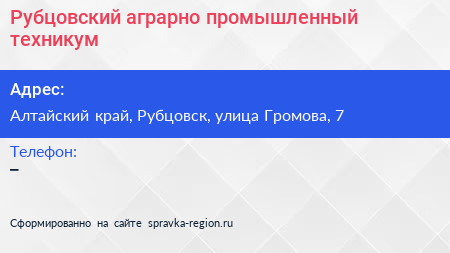 Рубцовский аграрно-промышленный техникум по адресу Алтайский край, Рубцовск, улица Громова, 7 в дальнейшем Организация, размещена в следующих категориях: