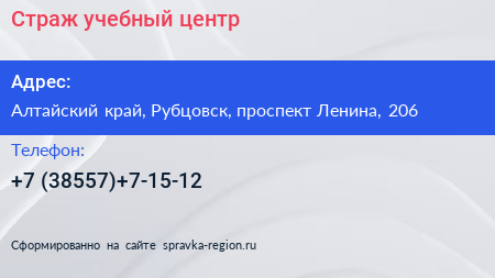 Страж, учебный центр по адресу Алтайский край, Рубцовск, проспект Ленина, 206 в дальнейшем Организация, размещена в следующих категориях: