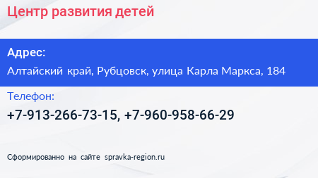 Центр развития детей по адресу Алтайский край, Рубцовск, улица Карла Маркса, 184 в дальнейшем Организация, размещена в следующих категориях: