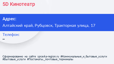 5D-Кинотеатр по адресу Алтайский край, Рубцовск, Тракторная улица, 17 в дальнейшем Организация, размещена в следующих категориях: