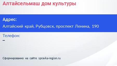Алтайсельмаш, дом культуры по адресу Алтайский край, Рубцовск, проспект Ленина, 190 в дальнейшем Организация, размещена в следующих категориях: