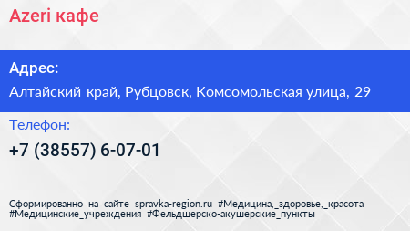 Azeri, кафе по адресу Алтайский край, Рубцовск, Комсомольская улица, 29 в дальнейшем Организация, размещена в следующих категориях: