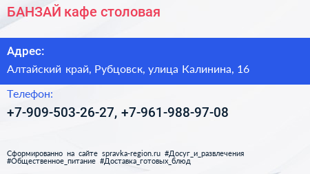 БАНЗАЙ, кафе-столовая по адресу Алтайский край, Рубцовск, улица Калинина, 16 в дальнейшем Организация, размещена в следующих категориях: