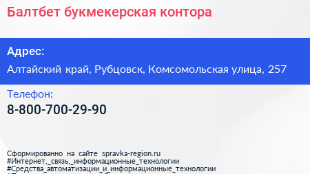 Балтбет, букмекерская контора по адресу Алтайский край, Рубцовск, Комсомольская улица, 257 в дальнейшем Организация, размещена в следующих категориях: