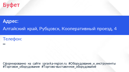 Буфет по адресу Алтайский край, Рубцовск, Кооперативный проезд, 4 в дальнейшем Организация, размещена в следующих категориях: