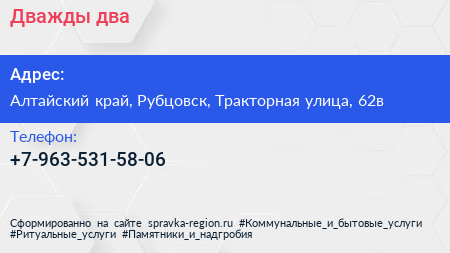 Дважды два по адресу Алтайский край, Рубцовск, Тракторная улица, 62в в дальнейшем Организация, размещена в следующих категориях: