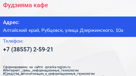 Фудзияма, кафе по адресу Алтайский край, Рубцовск, улица Дзержинского, 10а в дальнейшем Организация, размещена в следующих категориях: