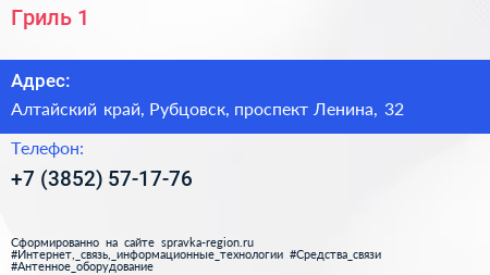 Гриль №1 по адресу Алтайский край, Рубцовск, проспект Ленина, 32 в дальнейшем Организация, размещена в следующих категориях: