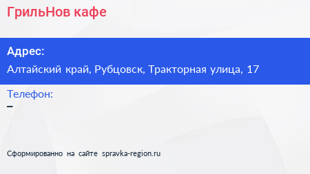ГрильНов, кафе по адресу Алтайский край, Рубцовск, Тракторная улица, 17 в дальнейшем Организация, размещена в следующих категориях: