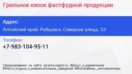 Грильнов, киоск фастфудной продукции по адресу Алтайский край, Рубцовск, Северная улица, 13 в дальнейшем Организация, размещена в следующих категориях: