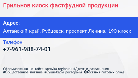 Грильнов, киоск фастфудной продукции по адресу Алтайский край, Рубцовск, проспект Ленина, 190 киоск в дальнейшем Организация, размещена в следующих категориях: