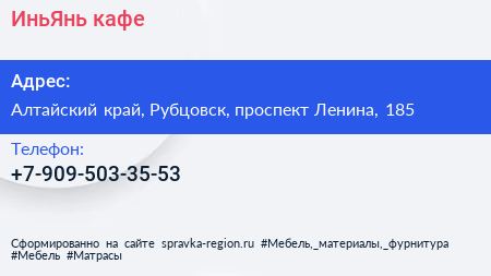 ИньЯнь, кафе по адресу Алтайский край, Рубцовск, проспект Ленина, 185 в дальнейшем Организация, размещена в следующих категориях: