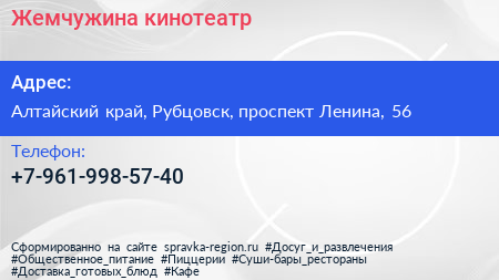 Жемчужина, кинотеатр по адресу Алтайский край, Рубцовск, проспект Ленина, 56 в дальнейшем Организация, размещена в следующих категориях: