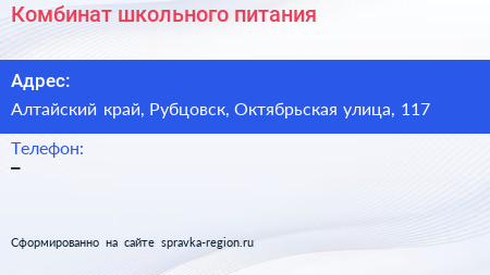 Комбинат школьного питания по адресу Алтайский край, Рубцовск, Октябрьская улица, 117 в дальнейшем Организация, размещена в следующих категориях: