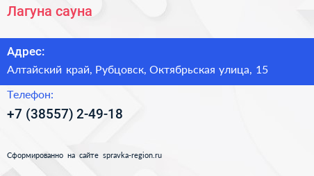 Лагуна, сауна по адресу Алтайский край, Рубцовск, Октябрьская улица, 15 в дальнейшем Организация, размещена в следующих категориях: