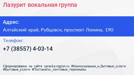 Лазурит, вокальная группа по адресу Алтайский край, Рубцовск, проспект Ленина, 190 в дальнейшем Организация, размещена в следующих категориях: