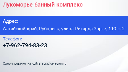 Лукоморье, банный комплекс по адресу Алтайский край, Рубцовск, улица Рихарда Зорге, 110 ст2 в дальнейшем Организация, размещена в следующих категориях: