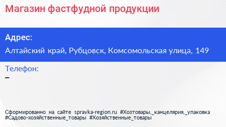 Магазин фастфудной продукции по адресу Алтайский край, Рубцовск, Комсомольская улица, 149 в дальнейшем Организация, размещена в следующих категориях: