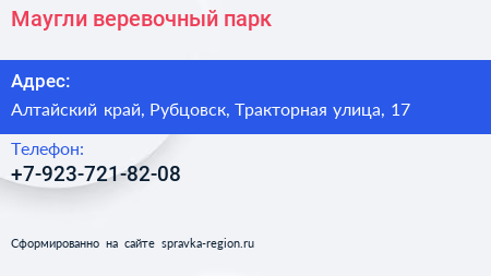Маугли, веревочный парк по адресу Алтайский край, Рубцовск, Тракторная улица, 17 в дальнейшем Организация, размещена в следующих категориях: