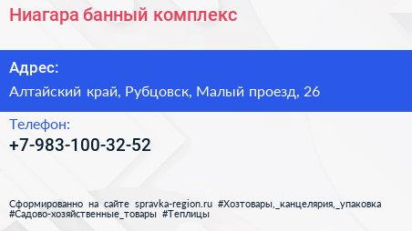 Ниагара, банный комплекс по адресу Алтайский край, Рубцовск, Малый проезд, 26 в дальнейшем Организация, размещена в следующих категориях: