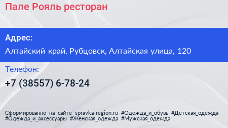 Пале-Рояль, ресторан по адресу Алтайский край, Рубцовск, Алтайская улица, 120 в дальнейшем Организация, размещена в следующих категориях: