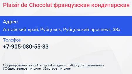Plaisir de Chocolat, французская кондитерская по адресу Алтайский край, Рубцовск, Рубцовский проспект, 38а в дальнейшем Организация, размещена в следующих категориях: