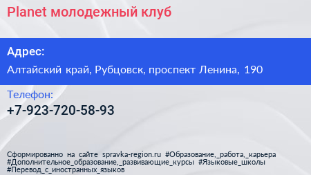 Planet, молодежный клуб по адресу Алтайский край, Рубцовск, проспект Ленина, 190 в дальнейшем Организация, размещена в следующих категориях: