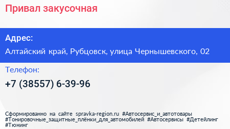 Привал, закусочная по адресу Алтайский край, Рубцовск, улица Чернышевского, 02 в дальнейшем Организация, размещена в следующих категориях: