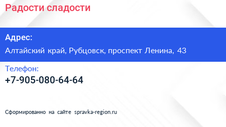 Радости сладости по адресу Алтайский край, Рубцовск, проспект Ленина, 43 в дальнейшем Организация, размещена в следующих категориях: