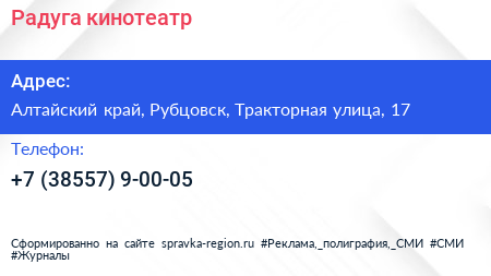 Радуга, кинотеатр по адресу Алтайский край, Рубцовск, Тракторная улица, 17 в дальнейшем Организация, размещена в следующих категориях:
