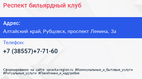Респект, бильярдный клуб по адресу Алтайский край, Рубцовск, проспект Ленина, 3а в дальнейшем Организация, размещена в следующих категориях: