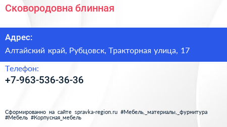 Сковородовна, блинная по адресу Алтайский край, Рубцовск, Тракторная улица, 17 в дальнейшем Организация, размещена в следующих категориях: