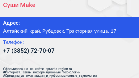 Суши Make по адресу Алтайский край, Рубцовск, Тракторная улица, 17 в дальнейшем Организация, размещена в следующих категориях: